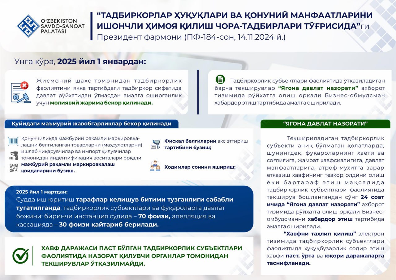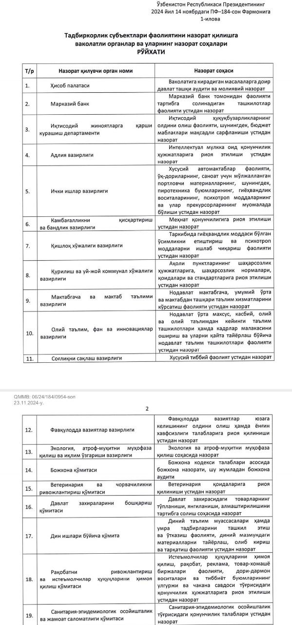 Tadbirkorlarni faqatgina ro‘yxatdagi 43 ta organ ko‘rsatilgan nazorat sohalari bo‘yicha tekshira oladi! O‘zbekiston Respublikasi Prezidentining 14.11…